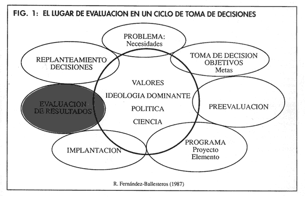 En todo caso, vamos a reflexionar brevemente sobre el ciclo de la planificación y acción social con el objetivo de ubicar en él la evaluación. En la figura 1 presentamos el diagrama de Fernández-Ballesteros (1987) en el que vamos a basarnos. Como puede verse, siete son las fases fundamentales del ciclo de planificación e intervención social; veámoslas brevemente.