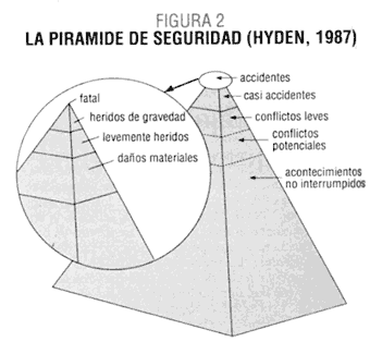 Una alternativa es la investigación de los acontecimientos que no son accidentes. Hyden (1987) propuso la idea de una pirámide de seguridad, representando un continuo de la gravedad de los acontecimientos que se presentan a los conductores. La base de esta pirámide consiste de las situaciones que son más frecuentes y no presentan un riesgo excesivo. Por encima de estas situaciones se presentan los casi accidentes y los conflictos.
