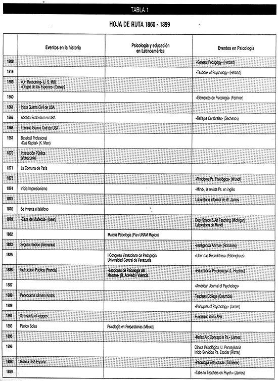 Desde mediados de 1800 hasta la segunda década del nuevo transcurrió en Latinoamérica un período sin mayores acontecimientos en relación a la nueva disciplina que se desarrollaba vigorosamente en Europa y en Norteamérica. Esto puede apreciarse en la Hoja de Ruta de la Tabla 1. Basta comparar el aumento en densidad de eventos en la columna central a medida que pasan los años. Para esta época aparecen unos cuantos elementos germinales: la inclusión de la Psicología, en 1882, entre las disciplinas contempladas en el plan de lo que habría de ser la nueva Universidad mexicana (Díaz Guerrero, 1984). La celebración en Caracas, a mediados de 1880, del I Congreso Venezolano de Pedagogía, en el cual se discuten el papel de la Psicología (Ruiz G.A. Comunicación personal, 4 de junio de 1992). El venezolano Rafael Acevedo publica en 1886 sus «Lecciones de Psicología del Maestro», en Valencia, España.