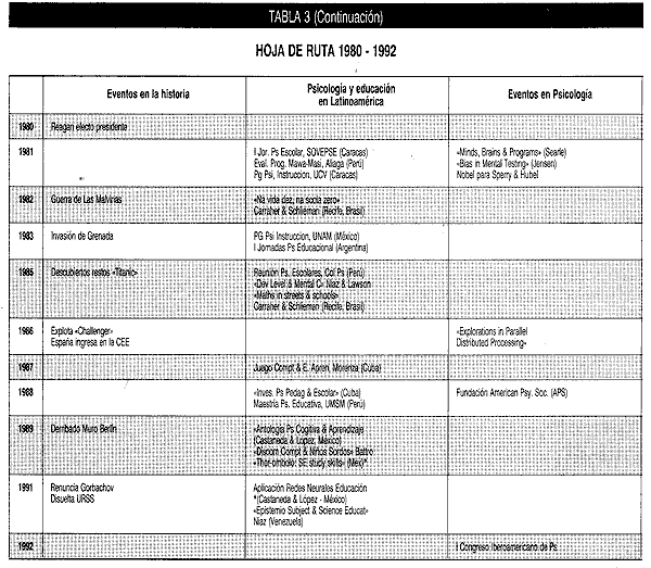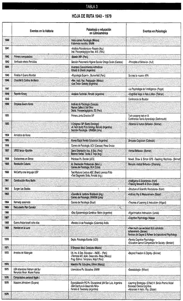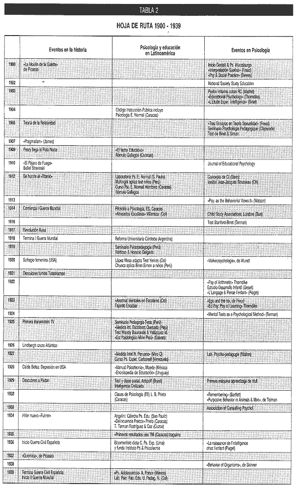 A fin de presentar una visión longitudinal del desarrollo de la Psicología Aplicada a la Educación se consideran por una parte tres etapas: los orígenes, la consolidación y las tendencias que me parecen vale la pena resaltar. Pero he adaptado el recurso que Leahey (1991), un historiador de la Psicología, utiliza para registrar los principales hitos en la Psicología y los correspondientes en la historia. He agregado una tercera columna para registrar los dos eventos relevantes de la Psicología y Educación en Latinoamérica, escogiendo de la información disponible los que, a mi juicio, son relevantes. De la información original de Leahey, se han tomado como base tanto los eventos en Psicología como los de la historia. En lo referente a los eventos en Psicología se le ha agregado información específica referente a aplicaciones de la Psicología relevantes para el área educativa. En esto ha sido muy útil el trabajo de Coll (1988). Asimismo, se han agregado eventos históricos sucesos no incluidos por Leahey y aquellos muy propios del ambiente latinoamericano. Esto se ilustra en las hojas de ruta, tal como se muestran en las Tablas 1, 2 y 3.