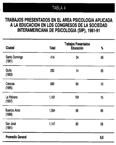Tabla 4. Trabajos presentados en el área psicología aplicada a la educación en los congresos de la sociedad interamericana de psicología (1981-91).