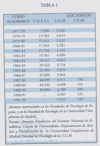 El número de alumnos que han cursado los estudios de Licenciatura en psicología no es fácil de precisar, porque varía según las fuentes. De acuerdo con la información que he podido recoger en el Departamento de Análisis y Planificación de la Universidad Complutense, en la Facultad de Psicología de esta Universidad y en el Instituto Nacional de Estadística, el número de matriculados en las Facultades de Psicología de España y en la Complutense se ofrece en la Tabla 1, con los alumnos de doctorado de la Complutense a partir del curso 1987-88.