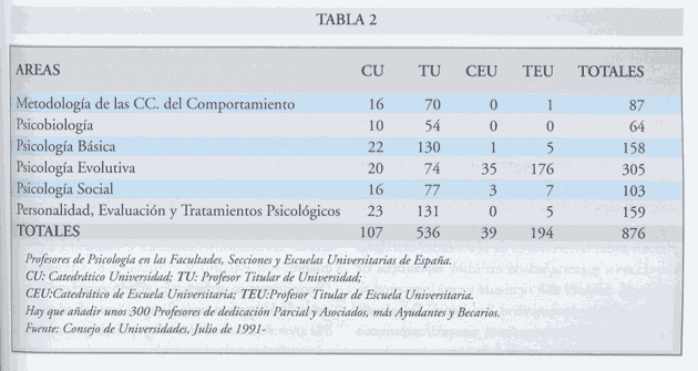 Los datos que he podido reunir sobre el profesorado de Psicología en España figuran en la tabla 2.