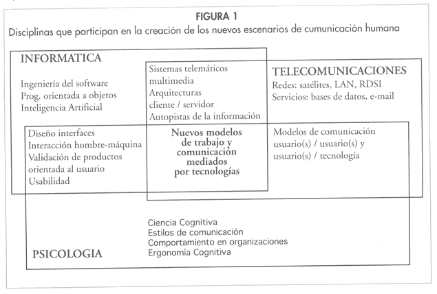 Cuando, tras la II Guerra Mundial, se inició esa escalada en las tecnologías de la información, los contenidos que se manejaban con ellas estaban muy influidos por restricciones de caracter técnico (lenguajes de programación logico-matemáticos), por lo que su uso quedaba limitado a los especialistas iniciados en la jerga (operadores, programadores, técnicos especializados, investigadores...etc). Además los entornos en que se utilizaban estaban aislados entre sí y muy restringidos a tareas puntuales de investigación científica o de desarrollo de tecnologías avanzadas. Sin embargo, al extenderse su uso, interconectarse entre ellas y acceder al gran público, tal como ocurre hoy día, se produjo un cambio cualitativo, que comenzó con la creación de una nueva ciencia (la Ciencia Cognitiva; véase p. e. Gardner,1985) y ha terminado impregnando la vida cotidiana. En efecto, los contenidos y tareas que hoy día son vehiculizados por estas tecnologías ya no son de caracter altamente especializado, sino que ahora una porción creciente de la comunicación y transferencia de conocimiento que diariamente se produce entre las personas normales está siendo mediada por distintos tipos de tecnologías y aplicaciones de este tipo. Así, el fenómeno ha desbordado el mundo de los especialistas para integrarse en la cultura cotidiana. A su vez esto ha exigido que el lenguaje técnico sea sustituido, poco a poco, por lo que podríamos calificar como una variante del lenguaje natural y los contenidos de las aplicaciones sean fácilmente accesibles para personas no-especializadas. En definitiva, todo esto está creando nuevos escenarios de interacción y comunicación humana mediada por la tecnologia. En la Figura.1 se ofrece un esquema de las distintas disciplinas cuya convergencia interdisciplinar ha dado lugar a este nuevo campo de aplicaciones.