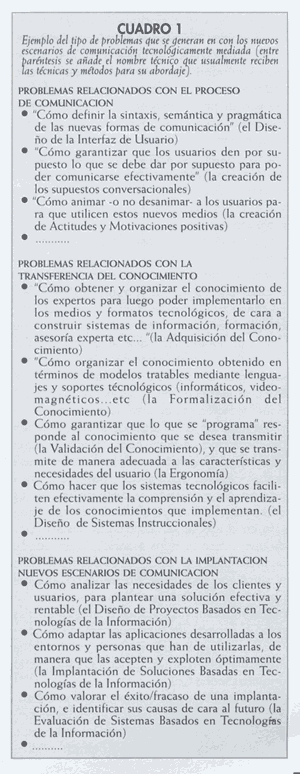 El desarrollo y explotación de estos nuevos escenarios de comunicación cotidiana y profesional está planteando toda una serie de nuevos problemas, en los que se entrelazan cuestiones técnicas y factores humanos de manera indisoluble (véase la Figura.1). Estos problemas se refieren a cuestiones tales como la forma en que se han de organizar los nuevos formatos de comunicación, la manera de aprovechar al máximo sus posibilidades de manejo y transferencia de conocimiento y las estrategias para implantar eficazmente este tipo de nuevas aplicaciones. En el Cuadro 1 se enumeran algunos de los problemas que aparecen en cada uno de esos aspectos. Evidentemente estos problemas estan demandando nuevas habilidades y estrategias de resolución de problemas tanto en los que desarrollan los productos y servicios como en los responsables de dirigir los correspondientes proyectos. Lo cual, a su vez, está abriendo nuevos campos profesionales para personas con un perfil que, a falta de mejor definición, suele caracterizarse como el de "un psicólogo/a con formación tecnológica" o el de "un tecnólogo/a con sensibilidad y formación psicológica".