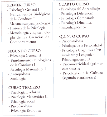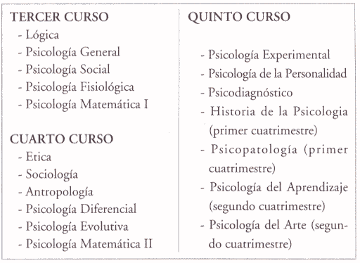 El esquema docente de la Psicología hasta bien entrada la década de los setenta estaba compuesto por dos años de estudios comunes con el resto de las especialidades de las Facultades de Filosofía y Letras y otros tres dedicados al estudio de las materias específicas. Los tres años de Psicología que comenzó a estudiar la primera promoción de licenciados en la Universidad Complutense de Madrid a partir de 1968 estaban compuestos por las siguientes materias , ver figura 1.