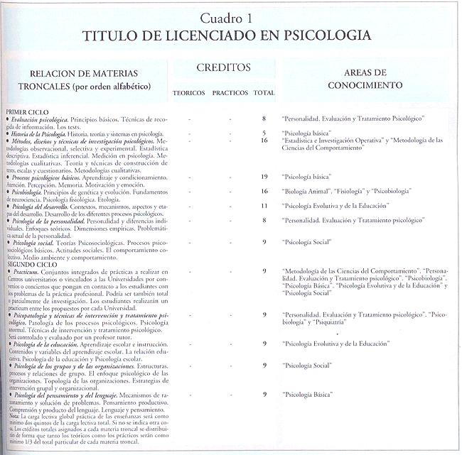 "Nuestra propuesta ha sido justamente la de reforzar al máximo esta filosofía de principio. Y lo hemos hecho de la manera que juzgamos más práctica: la de incrementar los créditos asignados a las materias troncales, por entender que tal y como su mismo nombre indica, se trata de materias de carácter eminentemente básico, imprescindibles para asegurar una adecuada formación de cara a la mayor especificidad y aplicabilidad propia del segundo ciclo. En resúmen, hemos propuesto un ciclo de carácter general, un ciclo de adquisición de conocimientos básicos, sin los que difícilmente puede operar la aplicación; un ciclo que garantice a nuestros estudiantes una sólida formación en aquellos aspectos que se consideran indispensables para el acceso a un segundo ciclo de carácter mucho más aplicado. De acuerdo con el grueso de nuestra propuesta, estos conocimientos se ubicarían en torno a cuatro grandes núcleos: el del estudio de las bases del comportamiento humano; el de los procesos psicológicos centrales (percepción, emoción, memoria, etc.), y el de las vías de acceso empírico e instrumental (análisis de datos, diseño de investigaciones, evaluación, etc.), a las interioridades de esos procesos y el de su transversalidad sociohistórica, y su lectura y reconciliación global (historia, aprendizaje, desarrollo, personalidad). Lo que con ello se pretende es acercar globalmente al estudiante a los secretos de una ciencia pura, a la especificidad de sus leyes y regularidades".