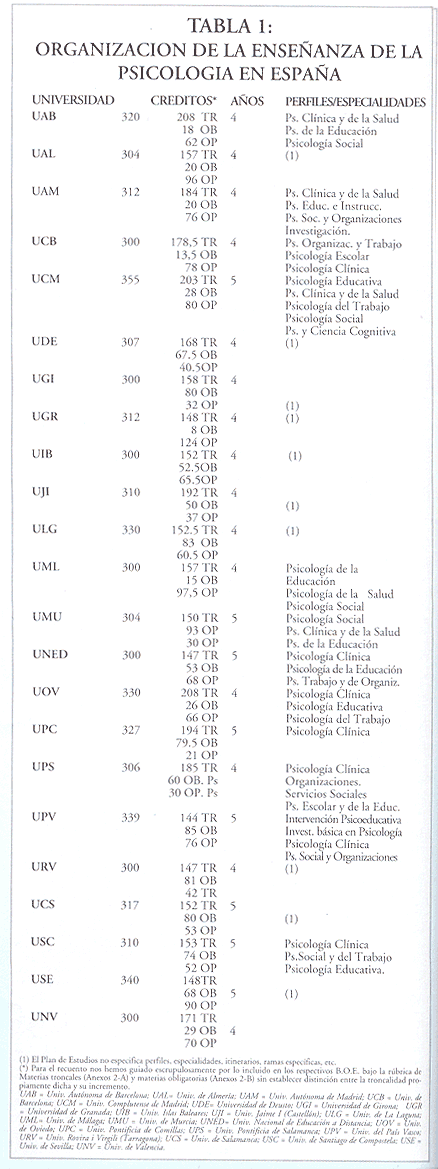 Tabla 1. Organización de la Enseñanza de la psicología en España.