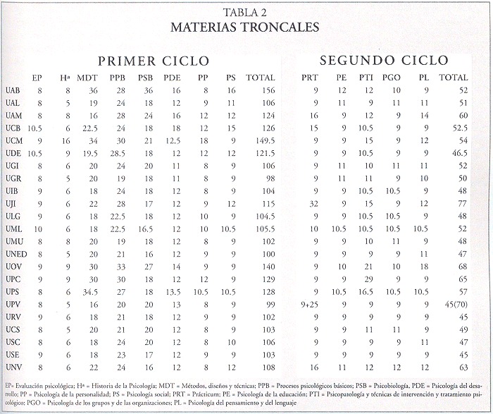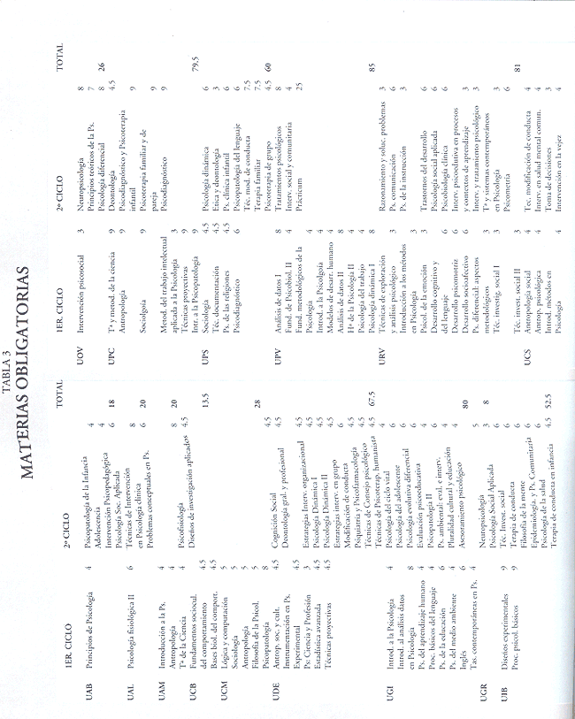 El panorama por el que va discurrir la formación de los psicólogos españoles del año 2000 se completa con la Tabla 3 que incluye una exhaustiva referencia a las materias obligatorias propias de cada una de las titulaciones y que conceden a cada una de las Facultades una distintividad en la formación de sus estudiantes.