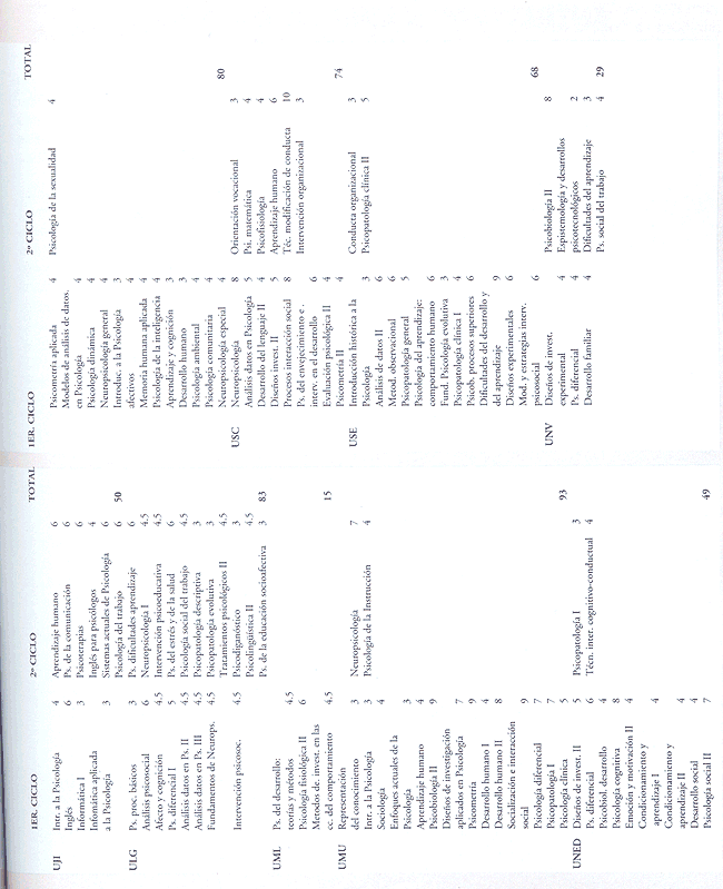 Otro bloque de asuntos tiene que ver con la traducción cualitativa de estos números; ahí la variabilidad parece que se restringe por cuanto es posible encontrar una serie de materias comunes en todas y cada una de las Facultades. La temática relacionada con la Metodología acostumbra a tener al menos tres materias prácticamente comunes en todos los títulos conducentes a la licenciatura en Psicología: