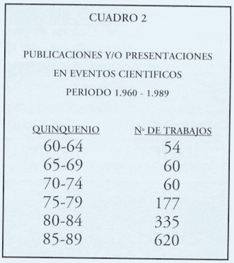 Cuadro 2. Publicaciones y presentaciones en Eventos Científicos 1960-1989.