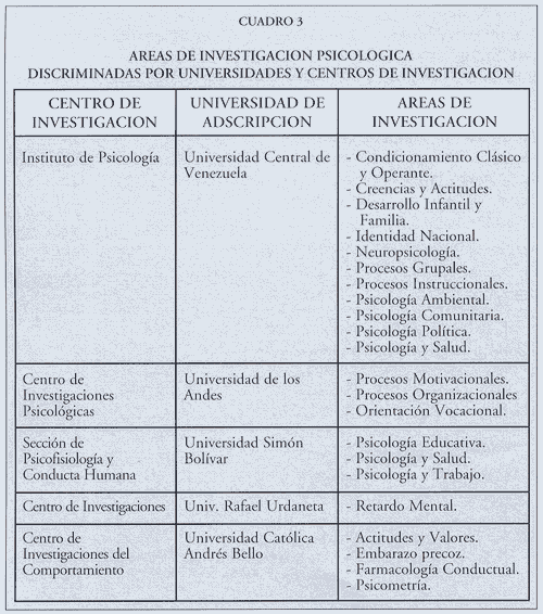 Cuadro 3. Áreas de Investigación Psicológica Discriminadas por Universidades y centros de investigación.