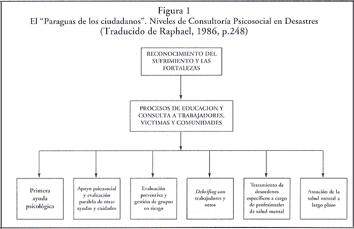 Ante la imposibilidad de aproximar posiciones tan dispares, y con el sólo fin de enfatizar los importantes compromisos que pueden asumir los profesionales de la Psicología en este campo específico de la Salud Mental -tan abreviadamente presentado-, se incluye la Figura 1 un modelo gráfico elaborado por Raphael (1986): "El paraguas de los cuidados". En el mismo se simbolizan los diferentes niveles del trabajo psicosocial que serían necesarios en el proceso de consultoría para la planificación y gestión de desastres.