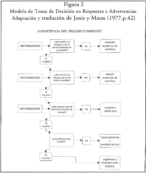 Retomando las contribuciones de Irving Janis, es posible aproximarse a otro núcleo temático de interés psicológico: la toma de decisión en emergencias. El modelo conceptual que dicho autor elabora se inscribe dentro de una teoría del conflicto (Janis y Mann, 1977) que recoge los desarrollos de la psicología del estrés, así como también una serie de aportaciones de Lewin y de Festinger.