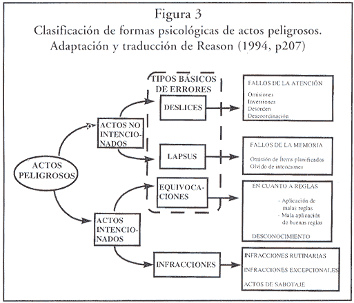 Las infracciones excepcionales, ejemplificadas por la conducta de los operarios de Chernobyl, no están en cambio tan claramente especificadas; dependen de un variado conjunto de circunstancias del entorno y quizá de las "imposiciones contradictorias del sistema" (Reason, 1989, p.24). En la Figura 3, se resumen las variadas formas psicológicas de actos peligrosos hasta aquí presentadas.