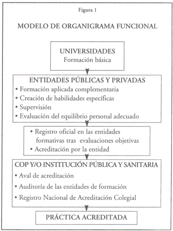3a) El tema de la acreditación del Psicólogo Clínico ya lo hemos tratado extensamente en otro lugar (Bas Ramallo, 1995). Reproducimos aquí el organigrama funcional que ofrecíamos como propuesta en ese anterior trabajo (Fig.1). El Perfil del Psicólogo Clínico, incluido en este mismo número de Papeles, se extiende también sobre este tema. Uno de nosotros formó parte de la Comisión de Expertos que trabajó con el COP para su elaboración. Ya entonces subrayamos la necesidad de la práctica supervisada previa y de un mínimo de equilibrio personal para poder ejercer la psicoterapia. Ambas funciones debería poder realizarlas el Centro de Formación correspondiente. Muchos Centros privados ejercen formación en psicoterapias a la vez que hacen terapia, y contar con personal acreditado para el ejercicio de sus labores asistenciales, de formación y supervisión es importante. La contratación de personal por las empresas se haría bajo un mayor nivel de confianza. En cualquier caso, el compromiso del COP con la idea del PIR y la formación práctica que reciben los estudiantes de Psicología no permite ya mucho margen de maniobra para hacer otras cosas. Nuestra vinculación a los foros europeos genera otro frente de condicionantes inevitables. El PIR favorecerá directamente a un pequeño número de psicólogos vínculados a la pública (normalizando su estatus y homologándonos como especialidad sanitaria), e, indirectamente, dará fortaleza a la imagen profesional del psicólogo clínico en general.