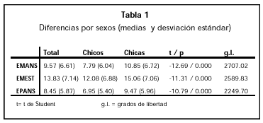 Tabla 1. Diferencias por sexos (medias y desviación estándar).