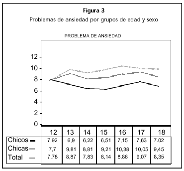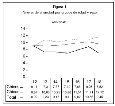 En las diferencias en función del sexo y la edad de los sujetos, los resultados coinciden con las investigaciones en las que los problemas de ansiedad excesiva parecen ser más frecuentes en chicas, y se incrementan con la edad (Bragado, 1994).