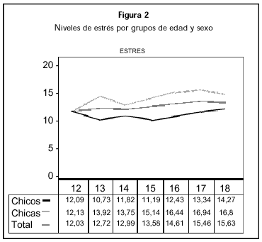 Considerando los resultados globales, los niveles de estrés aumentan con la edad, aunque aparecen oscilaciones en el intervalo de 12 a 15 años (Figura 2). Las diferencias estadísticamente significativas las encontramos entre las chicas de 12 a 14 años y las de 16 a 18 (F= 12,61, con 6 y 1664 g.l. y p = 0.0000), y entre los chicos de 13 y 15 años, y los de 17 y 18 (F= 3.56 con 6 y 1178 g.l. y p= 0.0017). La prueba de contraste utilizada en todos los casos ha sido Tukey b.
