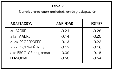 Los sujetos con mayores niveles de ansiedad y estrés y con más problemas de ansiedad eran los que presentaban peores resultados en adaptación (Tabla 2).