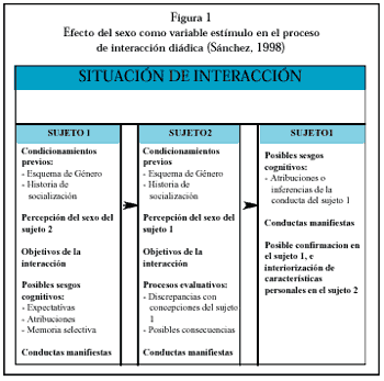 Desde el modelo de la doble realidad del sexo y del género, presentado, en líneas generales, en el primer artículo por Juan Fernández (para más información del modelo, ver Fernández, 1996, 1998), se denomina sexo como variable estímulo al efecto que el sexo ejerce sobre el comportamiento de los demás. En la figura 1 puede observarse el efecto de la variable sexo en una situación de interacción diádica.