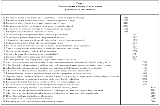 Tabla 1. Solución factorial mediante rotación oblicua y saturación de cada elemento.