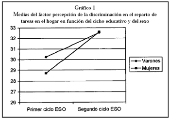 Gráfico 1. Medias del factor percepción de la discriminación en el reparto de tareas en el hogar en función del ciclo educativo y del sexo.
