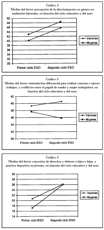 En el segundo factor, percepción de la discriminación de género en ambientes laborales, se obtuvieron dos efectos principales, tanto de la variable ciclo educativo (F=18.41, p=.000), como de la variable sexo (F=4.69, p<.031). Este resultado refleja, al igual que en el factor anterior, que los chicos y las chicas del segundo ciclo de ESO perciben una mayor desigualdad en el terreno laboral; además, el grupo de las chicas manifiesta una mayor percepción en la misma dirección (ver gráfico 2). El porcentaje de varianza explicada es mayor en la variable ciclo educativo (eta2=.24) que en la variable sexo (eta2=.11).
