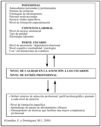 Existen otros aspectos personales y de capacitación profesional que tienen un efecto mediador en la experiencia de estrés, amortiguando o potenciando las consecuencias de los estresores potenciales. En la investigación realizada en una muestra de profesionales con experiencia laboral en diferentes recursos asistenciales (N = 171) (Jiménez González, Maroto Domínguez, Llorente Tejera, 1993a, 1993b), se afirma, que la elección de este área de trabajo responde a que actualmente existen mayores oportunidades de trabajo en este campo; sin embargo, no todos los profesionales contemplaban como primera opción personal trabajar con este sector de la población. Las capacidades de esfuerzo y trabajo son señaladas como las aptitudes más significativas y necesarias para desempeñar un adecuado nivel de atención. En cuanto a la relación con los ancianos, las áreas que describen como más problemáticas y estresantes son: el manejo de conductas problema, la comunicación, y el contacto diario con la enfermedad y la muerte.