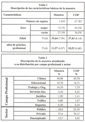 La encuesta se envió por correo a todos los miembros del Colegio Oficial de Psicólogos. Se incluía un sobre con el franqueo abonado y una carta explicativa de los objetivos de la encuesta. También era posible responder a la encuesta a través de internet, identificándose previamente como colegiado. Como se observa en la Tabla 1, se recibieron 3.455 respuestas válidas, un 12,4% de las cartas enviadas, lo cual puede considerarse satisfactorio. La distribución de las respuestas en función del área profesional, del sector de trabajo (público, privado) y tasa de desempleo puede observarse en la Tabla 2. Esta distribución es bastante coincidente con la distribución real, según los datos de los que dispone el Colegio Oficial de Psicólogos obtenidos en una muestra de 6.765 colegiados (columna COP de la Tabla 2), lo cual parece indicar que no se observan sesgos sistemáticos relevantes en el patrón de respuestas obtenido.