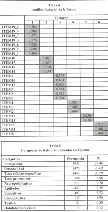 En el primer factor se agrupan todos los ítems relacionados con los problemas de uso de los tests en el entorno profesional de los psicólogos. El segundo factor también es muy claro, saturando en él los ítems indicadores de la actitud de los psicólogos hacia los tests. El tercer factor se refiere a la necesidad de regular el uso de los tests. El cuarto factor se centra en la formación, información y conocimientos sobre los tests. El quinto factor agrupa dos ítems referidos a la permisividad en el uso de las pruebas, y el sexto podría denominarse de competencia y derechos de las personas evaluadas. La estructura factorial resulta bastante clara y responde razonablemente a las dimensiones barajadas a la hora de construir los ítems.