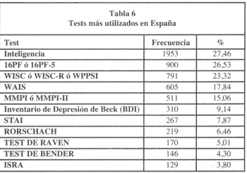 En la Tabla 5 aparecen clasificados por categorías los tests que aparecen citados como más utilizados por los psicólogos. En la Tabla 6 aparecen los tests concretos más utilizados. Como se puede observar se trata de tests clásicos, con predominio de los psicométricos frente a los proyectivos, de los que sólo aparece el Rorschach en séptimo lugar. Esto contrasta con los resultados obtenidos por Muñiz y cols. (1999) en los países latinoamericanos, donde predominan los tests proyectivos. En Argentina, por ejemplo, los tres tests más utilizados, según los expertos consultados, son, por este orden, el Rorschach, Figura Humana y TAT, es decir, los tres proyectivos.