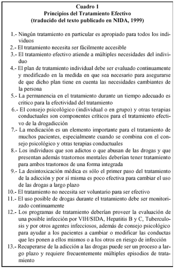 Sin embargo, si prestamos algo más de atención a los resultados que se han venido obteniendo en estas últimas décadas, tanto dentro de los grandes trabajos de investigación norteamericanos como en otros muchos trabajos más específicos americanos y europeos principalmente, se pueden entresacar una serie de principios generales que definen el tratamiento efectivo. Estos principios, que han sido publicados por el NIDA (National Institute on Drug Abuse de Estados Unidos) y recogidos en su integridad por la Asociación Psiquiátrica Americana, pueden verse en el cuadro 1 y nos servirán de base para pasar revista a alguno de los hallazgos más relevantes que deben ser comentados.