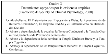 Según la Sociedad de Psicología Clínica (División XII de la APA) los tratamientos que están apoyados por la evidencia empírica serían los que aparecen reflejados en el Cuadro 3.