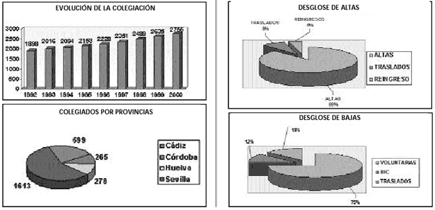 Gráficos. Evolución de la colegiación, colegiados por provincias, desglose de altas y bajas.