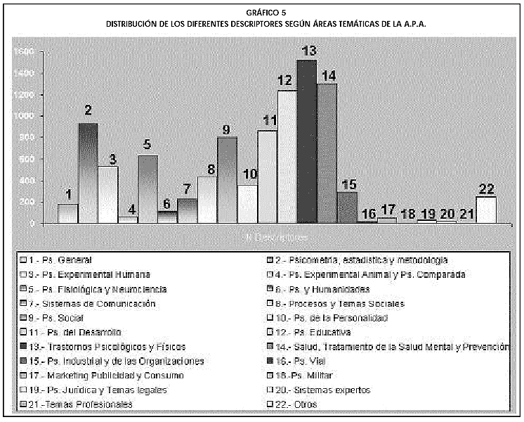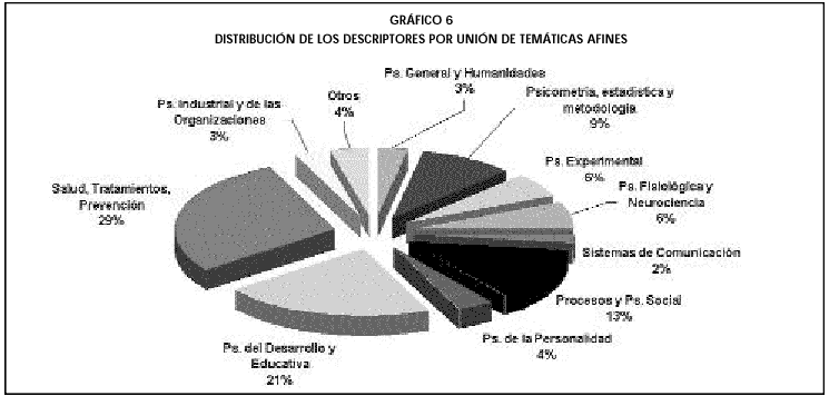 El 50% de los descriptores adscritos a las categorías anteriormente enunciadas corresponderían a términos pertenecientes a dos grandes áreas de la psicología: -Salud, Tratamiento de la Salud y Prevención- y, -Trastornos Psicológicos y Físicos- y a un segundo gran campo como es el de la Psicología del Desarrollo y la Psicología Educativa. A continuación, y realizando las mismas intervenciones siguiendo un orden lógico, se encontrarían Procesos Sociales y Psicología Social (13%); Psicometría, Estadística y Metodología con un 9%; con un 6%, cada una tendríamos a las áreas de Psicología Fisiológica y Neurociencia y Psicología Experimental; con un 4% los descriptores pertenecientes a Psicología de la Personalidad; el resto, hasta un 12% corresponderían a categorías pertenecientes a las diferentes ramas de la Psicología Industrial y de las Organizaciones, Psicología General y Humanidades, y por último Sistemas de comunicación y otros. (Ver Gráficos, 5 y 6).