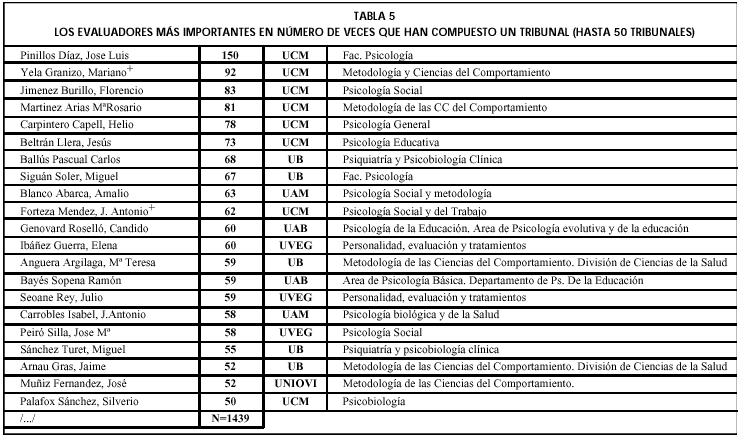 En nuestro caso, los 20 miembros de tribunal (.004%), muchos de ellos habituales presidentes como lo fueron de muchos tribunales de oposiciones y muchos proyectos subvencionados, más activos (criterio: que han asistido a la lectura de cincuenta tesis o más) en los tribunales de Tesis aparecen en cerca del 10% del total (ver Tabla 5). Se entiende que la proposición de cada uno de ellos viene avalado por la afinidad temática de las tesis doctorales, con respecto a su especialidad.