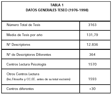 Para la realización de este trabajo nos basamos principalmente en la base de datos del Consejo de Universidades TESEO: (Tesis Españolas Ordenadas). Nos pusimos en contacto con los gestores de la citada base de datos, Secretaría de Estado de Universidades, quienes nos enviaron los datos totales de la tesis doctorales españolas que contemplaran entre sus descriptores algún concepto relativo a la ciencia psicológica.