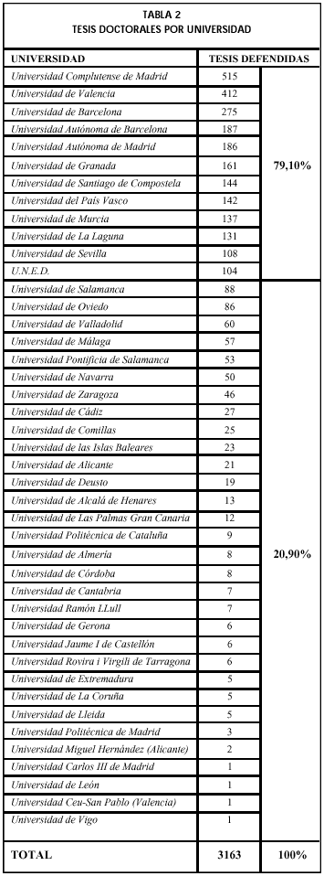 Siguen siendo tres las universidades que mayor produción de tesis de corte psicológico realizan: la Universidad Complutense de Madrid, la Universidad de Valencia y la Universidad de Barcelona. Estos resultados concuerdan cualitativamente con los realizados en un trabajo anterior por Mestre y Pérez-Delgado en 1991. Sin embargo estas tres universidades ya no acaparan la mitad de la producción de las tesis doctorales, como ocurría hace diez años. Con cerca del cuarenta por ciento y añadiendo que las doce facultades de psicología pertenecientes a las diferentes universidades, supone cerca del 80% de la realización de este tipo de trabajos.
