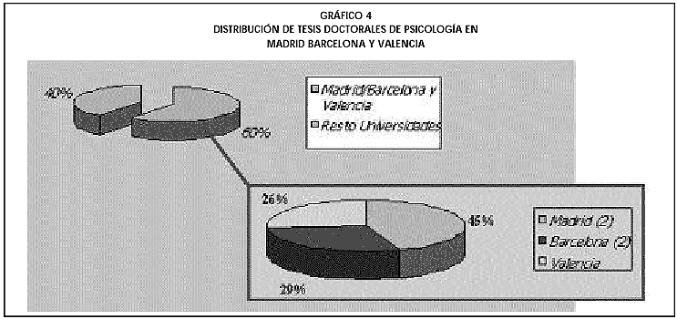 Gráfico 4. Distribución de tesis doctorales de psicología en Madrid, Barcelona y Valencia.