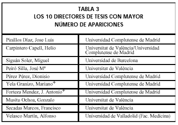 Los resultados obtenidos para este apartado nos hizo reflexionar sobre las personas que dirigían las tesis doctorales, si nos permiten utilizar una vieja expresión los "arquitectos" de la transformación (ver Tortosa y cols., 1995). Si tres son las universidades donde se producen el mayor número de doctorados, tiene que existir un correlato para los directores de tesis. Para la realización de los cálculos pertenecientes en el apartado de directores, hubo que completar muchos de los registros que aparecían en blanco. Una vez revisados y finalizada la recolección de los datos, se obtuvo la tabla que presentamos a continuación donde se colocan de manera apreciable los directores que en más ocasiones han dirigido tesis doctorales pero con la salvedad de hacerlo en primer lugar puesto que TESEO únicamente contempla las direcciones de tesis cuando aparecen en primer lugar, de manera que quedan en el más absoluto anonimato ese gran número de codirectores de tesis tan abundante dentro del panorama psicológico actual. Nuevamente tres universidades -UCM, UB, UVEG y excepcionalmente la Universidad de Valladolid, serán los lugares donde se asignan a los más prolíficos directores en la psicología española (ver Tabla 3).