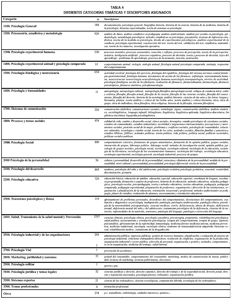 A la hora de realizar los diferentes cálculos se eliminó el termino psicología cuando aparecía en primer lugar y en solitario (en 2964 ocasiones), el número de descriptores totales descendió a 9.872. Una vez realizadas las correcciones atribuimos uno a uno, la totalidad de términos (a excepción de 254, que ubicamos bajo la categoría de Otros) a cada una de las categorías temáticas propuestas por la APA. A continuación presentamos la Tabla 4, donde se pueden observar los diferentes categorías temáticas y la asignación de los 364 descriptores diferentes.