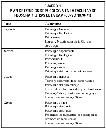 En el plano académico, la titulación de Psicología comienza ya a desprenderse de la tutela filosófica a comienzos de los años setenta. Y lo hace en la Universidad Autónoma de Madrid, cuya Facultad de Filosofía y Letras aprueba un innovador Plan de Estudios, que entra en vigor en el curso 1970-71 (B.O.E. 16/11/1971). En él se contempla tan sólo un primer curso común para todas las especialidades (Lengua española, Lengua y literatura latinas, Lengua y literatura griegas o árabes, Historia, Historia del Arte y Fundamentos de Filosofía) y reserva los cuatro restantes con materias propias de cada una de las ramas (ésa era la terminología utilizada). El currículo de Psicología quedó tempranamente atado a contenidos estrictamente psicológicos desde el segundo curso con las materias que quedan reflejadas en el Cuadro 1.