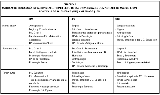 En 1975 la Dirección General de Universidades e Investigación da el visto bueno a la modificación del primer ciclo de la Sección de Psicología de la División de Filosofía y Ciencias de la Educación de la Facultad de Filosofía y Letras (ese galimatías burocrático tan propio de nuestro sistema universitario) de la Universidad Complutense de Madrid, que hasta entonces había tenido unos contenidos compartidos con el resto de titulaciones de la Facultad. Un año antes, la misma Dirección General de Universidades e Investigación aprobaba el primer ciclo de la Sección de Psicología de la Universidad Pontificia de Salamanca (B.O.E. 30/09/1974) y de la Universidad de Granada (B.O.E., 19/10, 1974). El Cuadro 2 recoge las materias que, a partir de entonces, comenzaron a impartirse en estas tres Universidades: