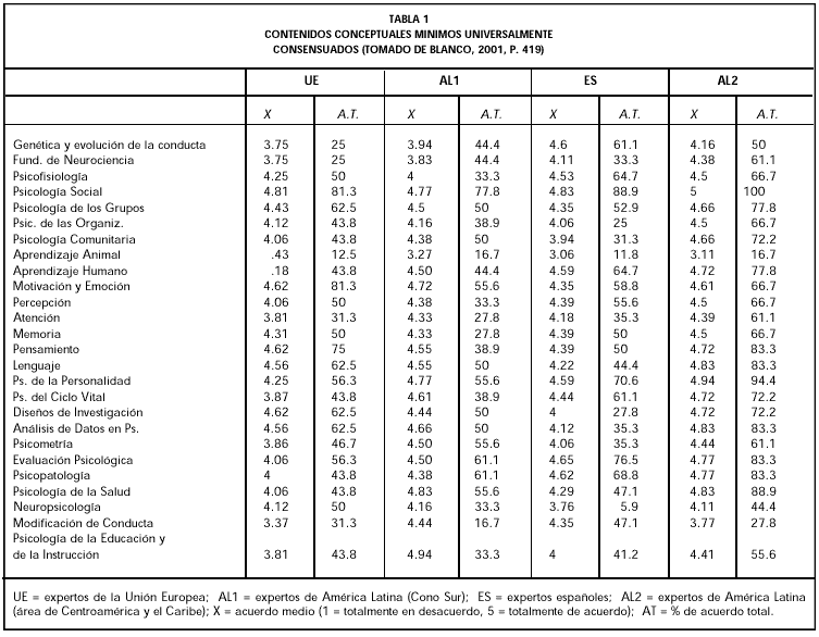 Tabla 1. Contenidos conceptuales minimos universalmente consensuados (tomado de blanco, 2001, p. 419).