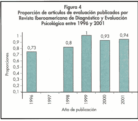 Figura 4. Proporción de artículos de evaluación publicados por Revista Iberoamericana de Diagnóstico y Evaluación Psicológica entre 1996 y 2001.